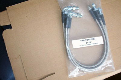 TR250/TR6 to Toyota 4 piston caliper steelbraid hose set. No adapters.needed. Front hoses direct from TR hard line fitting to Toyota caliper. |